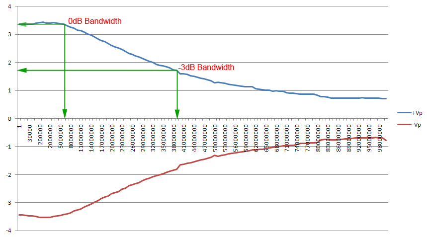 We can see clearly from the above figure that the Hantek output is not flat, ie the output will attenuate as the frequency is increased. If we are to specify the output bandwidth, at 0dB (zero) attenuation, the Hantek bandwidth is only up to around 6MHz, and at half of the maximum amplitude, ie -3dB attenuation, the Hantek is only spec'ed as 38MHz. This means, if you want to use the device for testing purpose with flat amplitude at 3.3V, you only can set the frequency up to 6MHz, beyond that, you will get lower amplitude which will affect the result of your testing. The same if you want to make a testing at around 1.65V, the limit is only up to 38MHz. This is hardware limitation and nothing we can do in software to increase the amplitude beyond the cone shaped envelop above. We can however, if we need greater amplitude, to build our own amplifying device to break this rule, one simple example is like my diy amplifier here which i call it 10x25 Amplifier since it can produce output of 10Vpeak at 0dB (5V @ 38MHz) when feed by Hantek output and ±12V power supply. But still with its amplified output, its profile will still follow the cone envelop since it inherit the shape from the Hantek output above (THS3091 opamp flat respond up to 100MHz, G = 5). For a really flat respond out of Hantek, we can find a way in hardware level to build a fancy respond device to compensate, but that is another story.