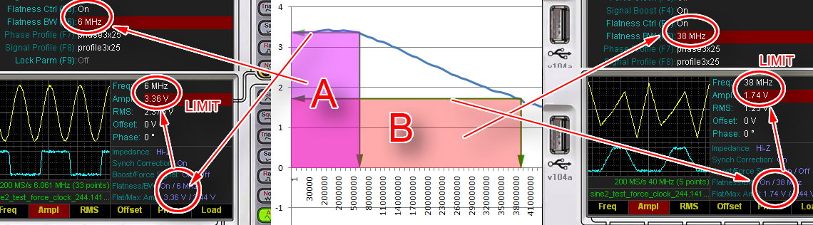 The above middle figure is cropped portion of the topmost graph profile figure. To activate Flatness Control in Goltek Controller Software, we go to Utility Panel and Set it to ON, and set the desired Flat Bandwidth (BW), let's say we want to work at max amplitude capability of the Hantek, ie 0dB, so we set the Flatness BW to 6MHz (left figure). by setting this, program will activate region A (purple rectangle region in middle figure), meaning we will only be able to work in region A, program will not allow you to set the frequency or amplitude past/outside that region, in this case 6MHz and 3.36V max, this is to ensure we are working in the flat region of 6MHz. We can set to lower frequency and amplitude value while in that region, and the program will do the necessary (vertical) scaling to ensure the Hantek flatness and output is what we are setting in the software. Outside this region, program will be unable to do the scaling since it will overflow the Hantek hardware resolution (12 bit) and how the internal mechanism of this program works. and most importantly it will not ensure flat output, which is the whole point about, hence the (frequency and amplitude) limitation applied. Similarly when we want more bandwidth, we set in Flatness BW for higher frequency, lets say 38MHz, then we will switch to region B (orange rectangle, some overlapping with Region A). in this region, we will only be able to work at lower amplitude to ensure flatness, so bear that in mind that there's compromise we have to make (lower amplitude). Even though Hantek is capable of doing more at lower frequency (higher amplitude) indicated by white triangle above region B (to the right of region A), but for the sake of flatness, the program will simply not allow you to. To get back full region/envelop of Hantek output capability, simply turn the Flatness Ctrl OFF, you'll get them all, except.... flatness.