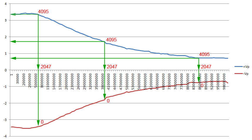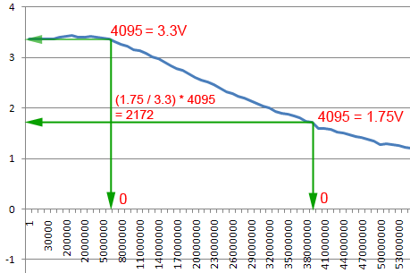 Data (array) that is sent to Hantek for signal generation is not what we think it is. We might think that we have to send volt values for Hantek to generate a signal like 3.5V, 3V, 1V, 0V, -1V, -3V, -3.5V? NO. We have to translate it to Hantek "language" or value, not the value that we like or used to or familiar with. Since Hantek is a 12bit resolution device, so it will only accept 12 bit binary values (there's 4096 values 0 - 4095). Hence we need to translate 3.5V to -3.5V range into 0 - 4095 range. With simple mathematics, that is easily achievable. And to make it worst, Hantek value is upside down, ie 3.5V eqv 0, and -3.5V eqv 4095! with 0V will be eqv to the middle of 4095 / 2 = 2047. But to avoid our mind get upside down, we just assume positive 3.5V eqv to 4095, negative 3.5V eqv 0 and middle 0V eqv 2047 as shown above figure (in reality 0 should be at the top, 4095 at the bottom). OK, we have not yet reach "The Method of Scaling" that i want to talk about for flatness control, this is just typical translation that we have to make from real world value to what Hantek understand. But let's look further in the above figure. During profiling process, we will request Hantek to output ±3.5V full voltage swing at any frequencies. But a flat ±3.5V swing throughout frequencies range is only theoretical, what we actually achieve is a non-flat signal. We keep giving Hantek the same full value range of 0 to 4095 at any frequency but we get different (actual) voltage swing. This is the role of Signal Profile File, to store these (attenuated) voltage values mainly for 2 purposes, 1 is to determine the flat voltage at certain bandwidth, hence will be used as limiting voltage in software, and 2nd purpose is for scaling purpose. How is the scaling for flatness purpose? Let us simplify even more the above figure into the figure below, ie we only consider positive voltage and assume that's the full 12 bit swing, ie 0 - 4095 for the simplicity of formulation...