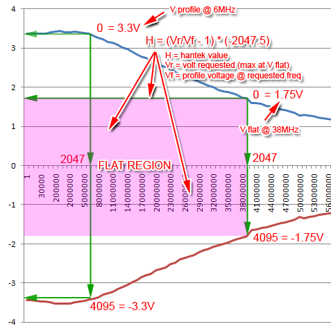 Now as said, during profiling process we keep sending the same 4095 (max) value to Hantek, but at different frequency we will get different voltage output. when we send 4095 value at 6MHz, we will get 3.3V out of Hantek, but we cannot expect the same voltage when we send the same 4095 at 38MHz, it will be different, ie only 1.75V. In the profile file, this voltage values is that matters, not the 4095 value, volt to 12bit translation only occurs in software using scaling of this values of voltages. How the scaling? well, let's assume we are dealing with 38MHz bandwidth flat voltage. from the profile, we (and the program) know that the voltage profile at 38MHz is 1.75V, this value will be the key (flat voltage) for the scaling. To get the flat voltage of 1.75V at different frequency, we get the flat (key) voltage divided to the profile voltage at the requested frequency. Let say we want to get flat voltage at 6MHz. The voltage profile of 6MHz is 3.3V, so we divide (key / profile) * 4095, ie (1.75 / 3.3) * 4095 = 2175. So if we send value 2175 at 6MHz to Hantek, we will get the output voltage the same as the max (profile) voltage at 38MHz, ie 1.75V. By this simple scaling, we have achieved flat voltage between 6MHz and 38MHz, simple! the same method will be used for other frequency less than or equal to 38MHz, and guess what value should we send to Hantek to get the flat voltage of 1.75V at 38MHz? right! its the [key / (profile @ 38MHz)] * 4095 = (1.75 / 1.75) * 4095 = 4095! the max Hantek Value! as mentioned, this is highly simplified version. the real formulation is a bit messier than this. I will just describe it in the figure below, enjoy!