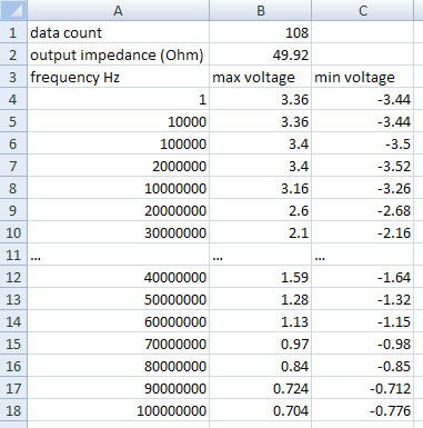 Signal Profile File is a csv formatted file storing voltage (attenuation) amplitude of the Output Signal of Hantek DDS3x25 (or its add-on device). It acts as a lookup table for Goltek Controller to compensate for Flat Signal and Bandwidth Limitation. A brief explanation on how its done is discussed in Flatness Control and Bandwidth Limitation. Let's look at what's inside... This is how its looks like in Ms Excel (figure below). The first line showing how many data available, i've deleted some of them for simplicity, originally there should be 108 data (row). The second line is the output impedance of The Hantek device, you can get the value from your device specification manual, or more reliably it can be retrieved by measuring the resistor just before the device + output impedance of the opamp driving it (LMH6702), in the example below, the total is 49.92 ohm. The 3rd line is just labeling to show what's in each column stand for. Our data start at 4th line, there's 3 column in each data, ie frequency, max and min voltage, at the time of this writing, the 3rd column is not implemented and will be ignored, it is assume the output signal will be symmetrical, ie min = -max volt. We only look at the 1st 2 column, ie frequency and its max voltage.