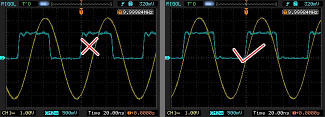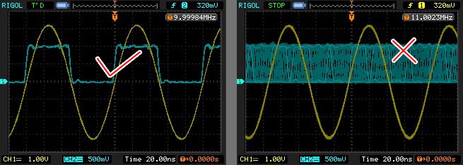 In the above figure, the yellow trace is the Output Signal from Hantek 3x25, and the blue trace is the Synch Signal from it. On the left figure we can see yellow and blue trace are nicely In-Phase or In-Synch, where on the right figure, both are not In-Synch, ie no correlation between both's phases. Hantek use mechanism of Number of Points (nPts) and Number of Periods (nPer) to generate DDS signal. It means, the software needs to fill nPer of signal cycle in nPts of data array. Let say nPts = 4000, nPer = 40 (freq request of 2MHz), and we try to send sine signal to Hantek. it means there should be 40 cycles of sine in 4000 data points (Integer array) created by software and then later to be sent to Hantek, in this case, in each 100 data points, there's a complete 1 cycle of sine signal. Hantek use this mechanism to enable it to produce any number of frequencies albeit its clock limitation only divisible by integer number (200MHz / n, where n is integer number = 1,2,...,97656). So for the above case, nPts / nPer (4000 / 40) is exact integer value, so the sine (Output) signal will be in-line (In-Synch) with Hantek clock (Synch Signal). but what about if we request the frequency that will result in non integer division of nPts / nPer. Let say we request for frequency 3MHz, Hantek will return nPts = 4066, nPer = 61, ie 66.66 points per period (4066 / 61). This is non-integer division and hence, Hantek clock will be unable to get in-line with 66.66 points. By nature (hardware or firmware?), Hantek clock only capable to get inline with 66 or 67 points of data per period. This results in slight deviation from our frequency request (3MHz), ie for exact 3MHz eqv to 66.66 points/period, theoretically, Hantek clock should be 199.967213 MHz (clock = freq * (nPts / nPer)), but practically its not, we have to round off to 66 or 67 nPts / nPer. using "Mark Madel's Estimation", the Hantek clock for frequency request 3MHz will be 200MHz, so our 3MHz signal request will only be able to synchronize with Hantek clock (or Synch Signal) at freq 3.03MHz (200MHz / 66) or at freq 2.985MHz (200MHz / 67). So, in Goltek Controller, if Stable Synch feature is enabled, the program will round off this non integer division into integer division, so instead of using 66.66 points per period to generate 1 cycle of sine, the program will round it off to 67 points which result in lower frequency output compared to the requested value. So there will be compromise, if you want to get In-Synch with Hantek clock, you have to accept some frequency deviation (3MHz -> 2.985MHz), but if you need the exact 3MHz reproduction from Hantek, then you will not be able to get In-Synch with Hantek clock (Synch signal). Your specific application may prefer either one, to get In-Synch, or exact (closest) frequency output as requested, but not both, except at lower frequency (<=1MHz) or at some specific higher frequencies that's by nature are integer divisible (sweet spot) to the Hantek clock for example 2MHz, 4MHz, 5MHz, 10MHz, 20MHz, 50MHz or 100MHz.